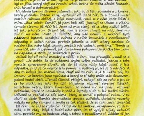 Jednoho dne měl jít s rodiči na výlet právě sem do lesa. Výlety nesnášel, avšak tento považoval za dobrou příležitost vyzkoušet, jak bude jeho nový prak střílet na veverky. A tak jakmile byl v lese, neztrácel čas, nechal jít rodiče napřed a pustil se do „práce“. Veverky ho ale slyšely přicházet a stihly se mu všechny ztratit z cesty. Tak zkoušel střílet alespoň na nehybný cíl, vybral si k tomu mladý stromek. Mířit uměl dobře, to se musí nechat, téměř pokaždé se strefil. V tom jako by slyšel slabounký hlásek: „Au, co to děláš, to bolí!“ Tomáš se zamračil. Rozhlížel se okolo sebe, ale nikdo tam nebyl. Objevil však obrovské mraveniště. Napadlo ho, že by mohlo být zábavné trochu provětrat mravence, ale neměl dost odvahy na to postavit se jim holýma rukama. Tak přiskočil k prvnímu stromku a začal mu lámat větev. Když najednou opět uslyšel ten hlas: „Au, jsi normální? Co jsem ti udělala, že mě tahle mučíš?“ a spadla na něj šiška.